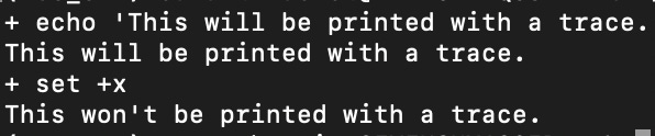 This demonstration shows every line executed from the point set -x is called until the command set +x is called. After set +x the normal operation resumes, i.e. commands will not be printed before their execution.